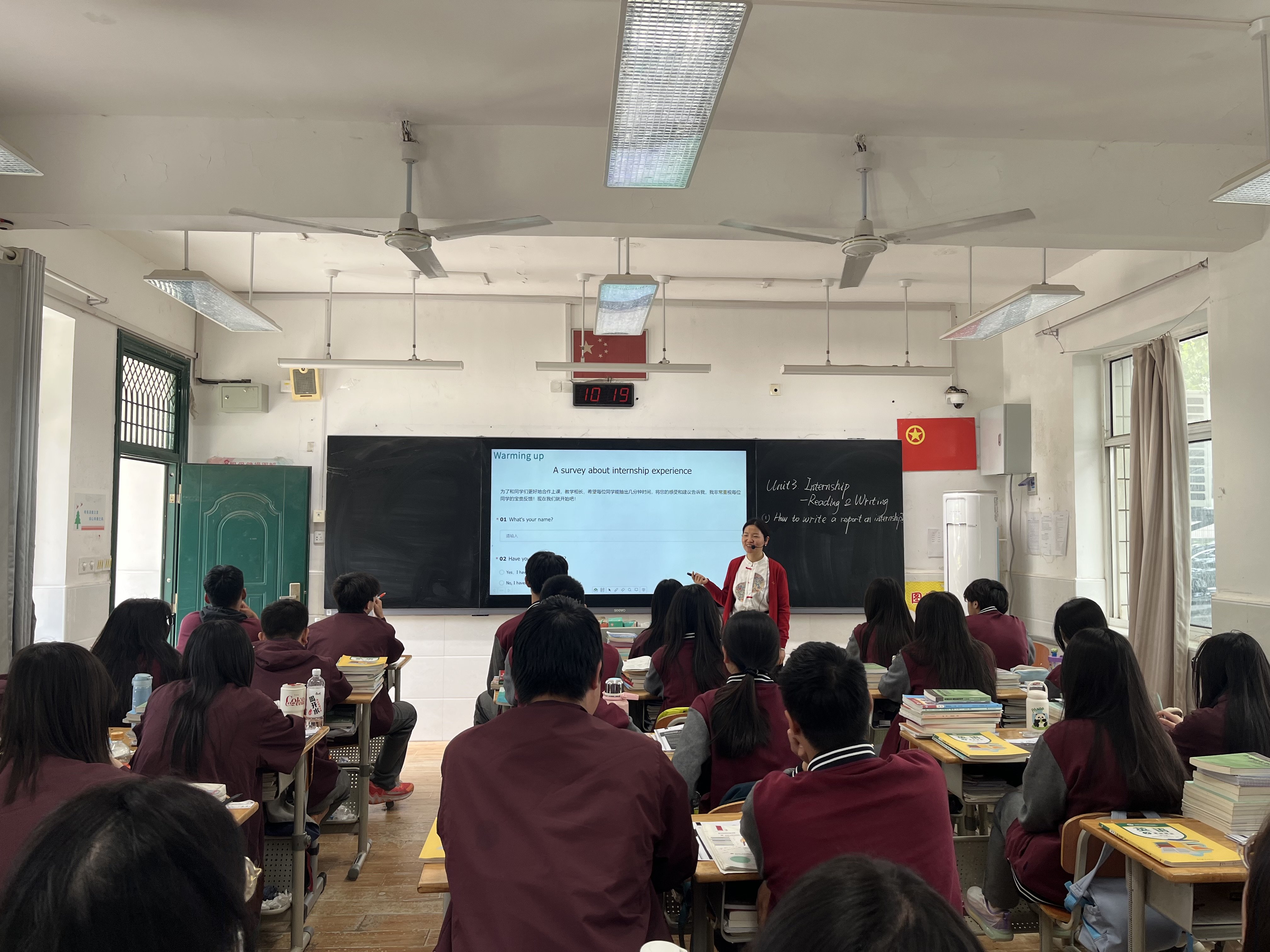 第三节是张玉扣老师借班开设的读写课:“Internship---Reading and writing”。张老师采用了“任务型”教学法,从分析与“项目描述”文章的思维导图出发,启发学生从思考与“实习报告”相关的小标题开始,再联系相关的内容来组织和编写“实习报告”,以达成本节课的学习任务。教学过程中,张老师注重培养学生的自主学习能力和小组合作能力,引导学生把学习当“工作”并从中培养“团队合作”的责任意识。教学环节中注重思政教育,鼓励学生从热爱当下的学习开始到将来热爱自己的工作,从而培养学生们“爱岗敬业”的职业精神。