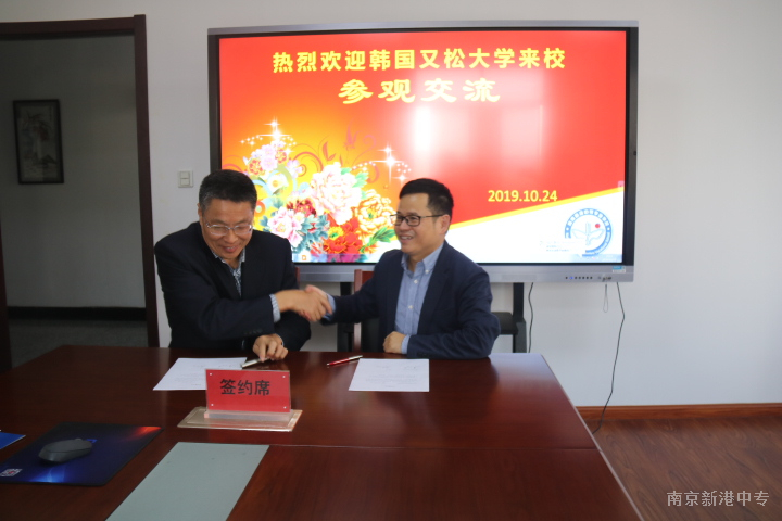 首先南京新港中专校刘俊副校长重点介绍了学校的多种办学模式及专业特色。中韩双方在了解彼此合作学校的具体情况后,依次观看了韩国又松大学和新港中专校的宣传片,进一步深入了解彼此合作学校的办学特色、办学理念以及办学模式。随后,由江苏玺礼教育牵线搭桥,韩国又松大学与南京新港中专校达成国际合作意向,童礼荣校长和又松大学高忠义主任签订了合作意向书。之后,双方一起参观了学校物流实训室和海尔物联网学院,参观中表示两校将有多个相同专业可对接。