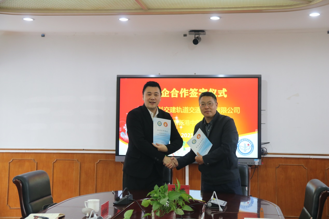 2021年4月20日,南京新港中等专业学校与江苏科交建轨道交通科技有限公司在新港中专尧化校区二楼会议室举行了校企合作签约仪式。江苏科交建轨道交通科技有限公司总经理汪峰、副总经理曾香、校企合作办主任席梦滢、张训凡,南京新港中等专业学校校长童礼荣、副校长吴恩朝、副校长刘俊、办公室副主任万宝国、机电系副主任翟磊等参加了签字仪式。