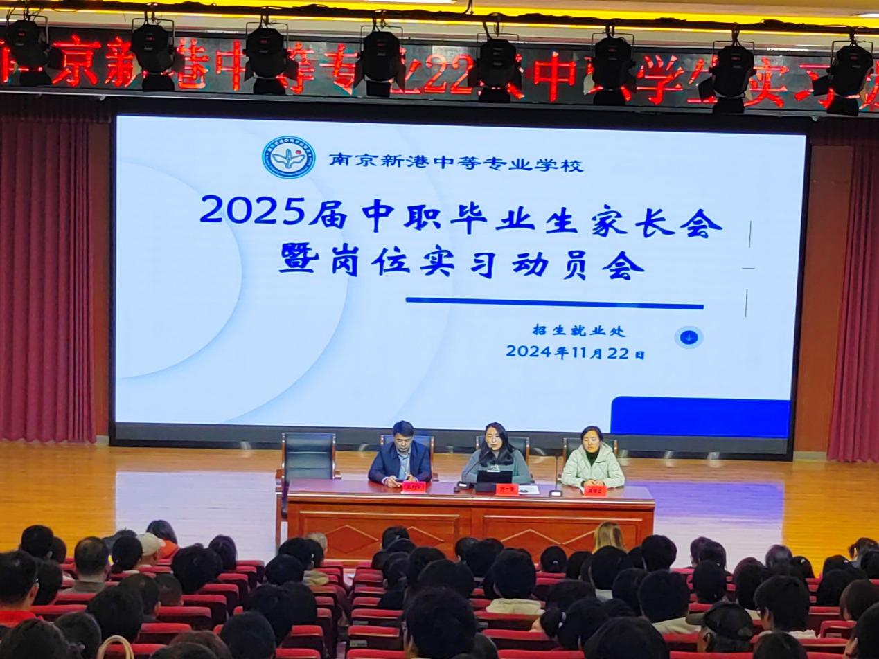 2024年11月22日下午,南京新港中专校在丁家庄校区报告厅召开了2025届中职毕业生家长会暨岗前实习动员会,会议由招生就业处副主任闫会龙主持,万兰平副校长、施向军副校长、招生就业处黄翠云主任、各系部主任及2022级全体中职班主任参加此次会议。